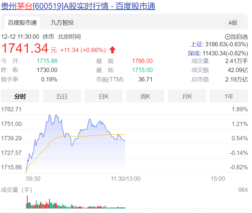 同时,贵州茅台股价持续上涨,已达1741.34元/股,总市值已达2.19万亿.